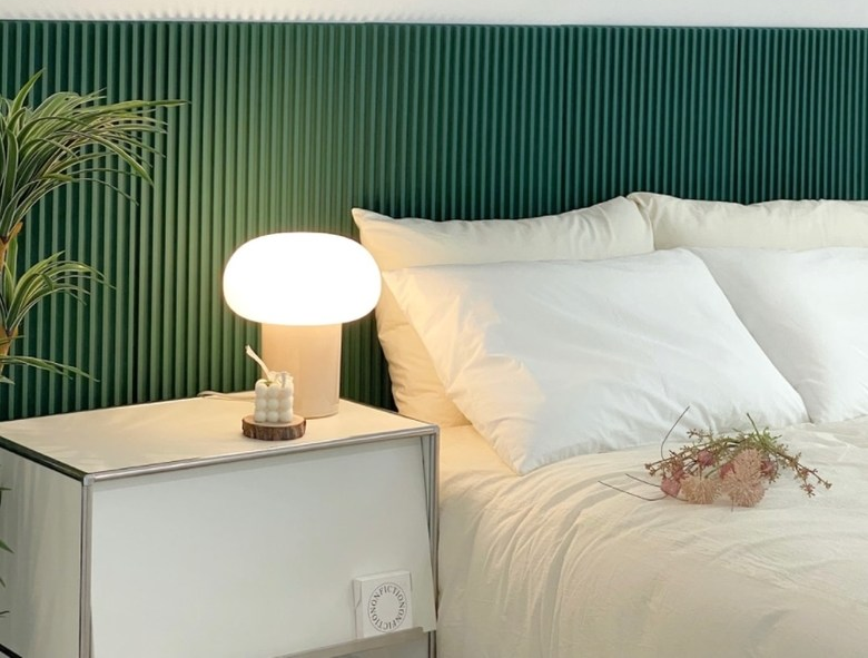 실제로 템바보드로 인테리어를 하면, 정말 다양한 스타일을 연출할 수 있어. 예를 들어, 다소 밋밋할 수 있는 흰색 침대에 초록색 템바보드를 두면 트렌디한 이미지를 줄 수 있어.