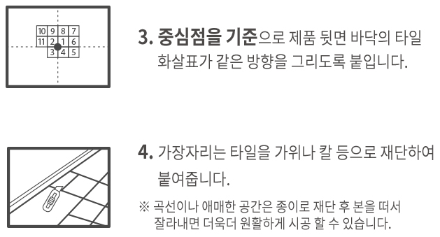 - 시작 지점 확인하기 : 바닥의 중간지점에서 시작해서 밖으로 하나씩 부착하면 돼.